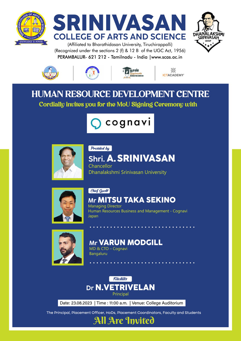 SCAS is glad to inform you that our HRDC will have MoU signing with Cognavi - Japan based company for exploring assessment, learning and placement opportunities for the final year students of our college. MoU signing will be held at our Esteemed Chancellor Ayya's chamber at 10:00am. You are cordially invited.